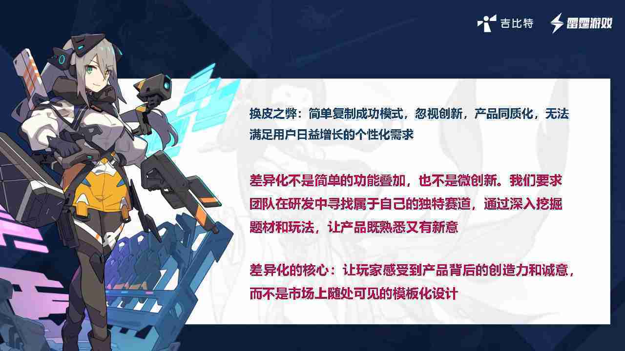 在我们内部是这么定义差异化的。。。首先,,差异化不是简单的功能叠加,,,,更不是换皮。。只是换皮,,产品无法提供有效的市场价值。。。。内部经常说差异化的产品不是为了迎合市场,,,而是找到一个自己独特的表达方式,,在研发中找到属于自己的细分赛道和独特赛道,,,,前提是需要对这个题材有足够的深入、、、挖掘,,,对玩法有足够深入的理解,,让产品看起来既熟悉又有新意。。