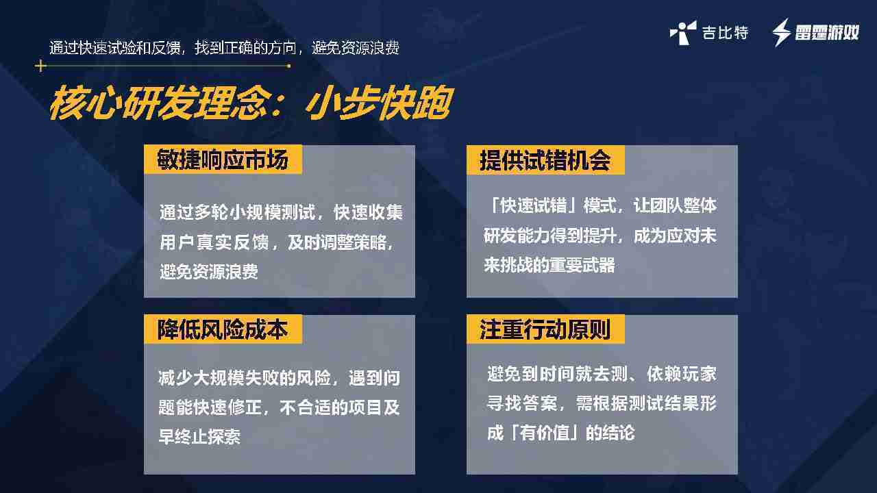 小步快跑不是找答案,,而是验证答案。。。我们之前有项目是这样的,,有些制作人会有几个方向觉得都可以做,,,,但是不确定做哪一个,,,,会选择几个都做,,,,做完拿到市场跑,,,,跑出哪一个更好,,,,基于这个再做后续的研发和拓展。。但这种情况最容易出现一个问题,,,,可能被玩家裹胁,,,玩家说这个点不错、、、、那个点不错,,,到底听还是不听,,,不听感觉是无视玩家的反馈,,听的话,,,可能自己没想清楚导致研发思路发生偏颇。。。所以针对这一点后面自己复盘整理,,发现制作人自己心里要有数,,,,要做自己觉得好玩的,,,,而且明确知道这个东西是你想做的,,,然后拿到市场验证这个答案是不是对的,,,,而不是拿一堆答案找哪一个答案更好。。