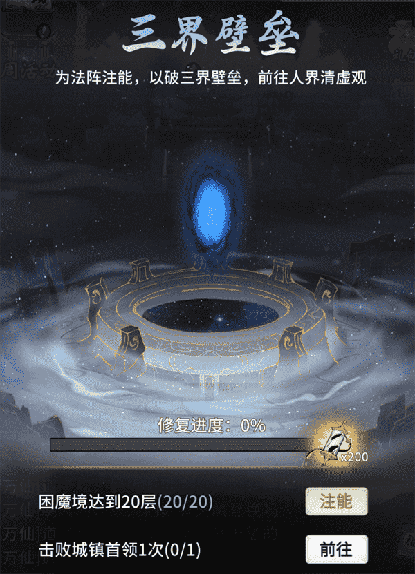 当你修为达到返虚/破虚中期后,,,可在城镇寻得芸丫并激活神秘法阵,,,通过收集材料、、、击败首领等方式为法阵注能,,,借以打破三界壁垒,,,开启支线剧情“清虚旧梦”